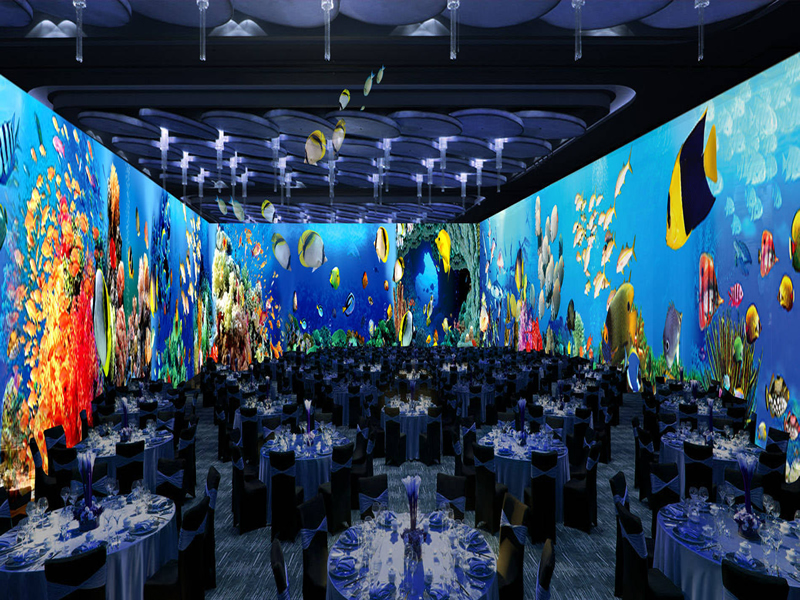 適用于100㎡以下包廂或宴會分區,配置4-6臺國產短焦投影機(單臺3-5萬元),搭配基礎金屬幕布(300元/㎡)??蓪崿F墻面圖案投射、氛圍光影變換等基礎功能,支持預制模板內容播放。杭州某連鎖餐飲企業負責人透露:“改造3個主題包廂花了28萬,節假日預訂率提升40%。”