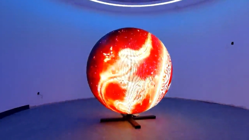 這個球體是個led的球形屏幕放在中間剛好和四周的投影墻相輔相成。